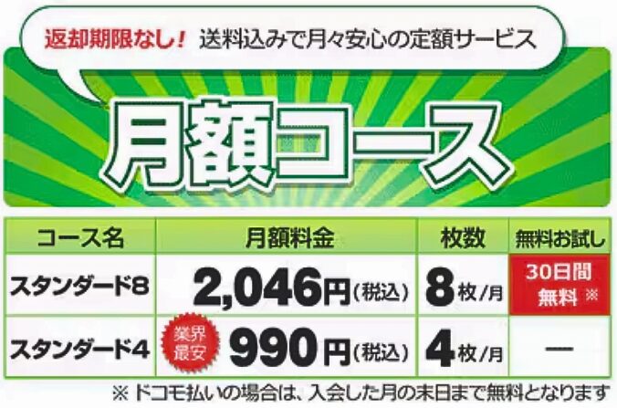 大丈夫です。スマホだけで数分で完了しますし、しかも【スタンダード8】なら30日間は無料でDVDレンタルを体験できるんですよ。