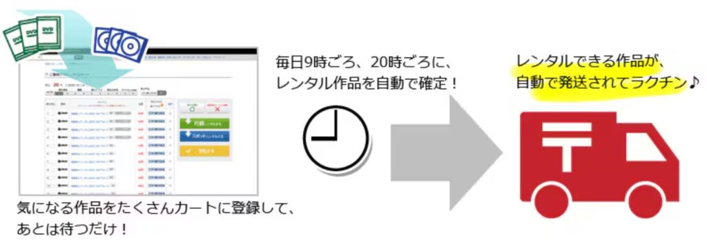 発送単位の不足も原因の一つです。月額レンタルは2枚1セットでの発送が原則なので、カートに「すぐ借りられる」作品が1枚しかないと発送されません。