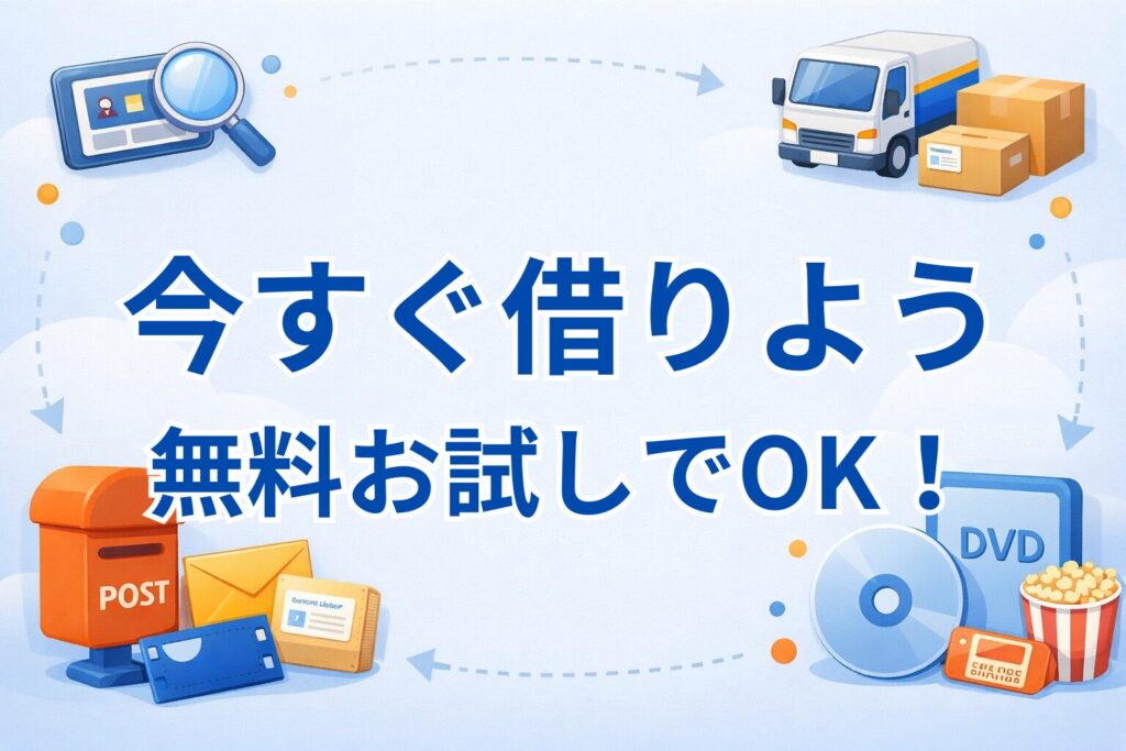 在庫の見方とコツが分かったら、実際に無料お試しでレンタルを始めてみましょう。事前準備をしっかり行えば、初回からスムーズに作品を借りられます。
