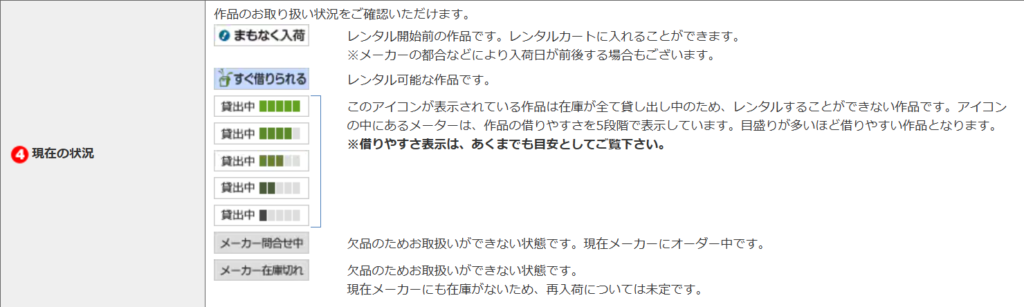「レンタル可能」アイコンが表示されている作品は、カートに入れて注文すれば今すぐ発送準備に入ります。「貸出中」アイコンには5段階の借りやすさメーターが付いており、目盛りが多いほど返却後の確保が容易になります。