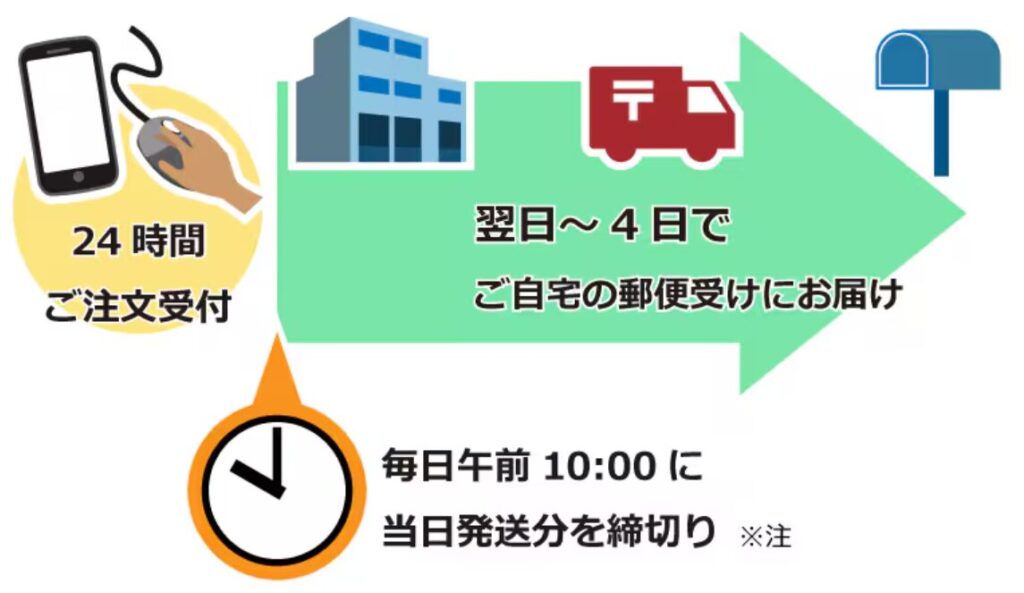 注文後に発送され、配送業者が届けてくれるので、特別な手続きや受け取り準備は必要ありません。ポストを確認するだけでOKなのは楽ですよね。