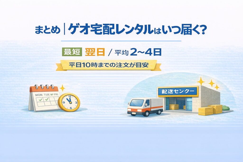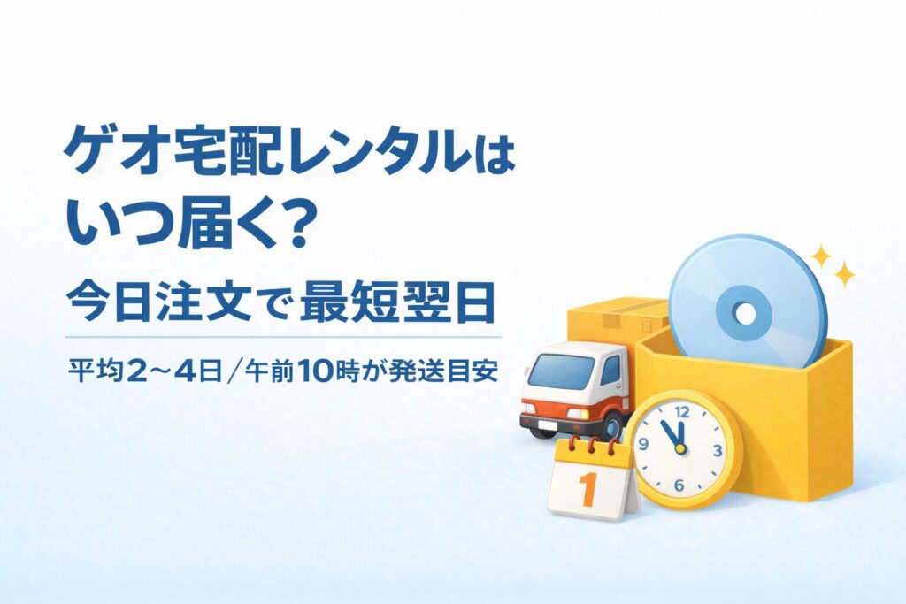 まず、ゲオ宅配レンタルは、 午前10時までに注文できれば当日発送になりやすく、最短で翌日に届く可能性があります。 平均的な到着目安は2〜4日ほどで、地域や曜日によって前後します。