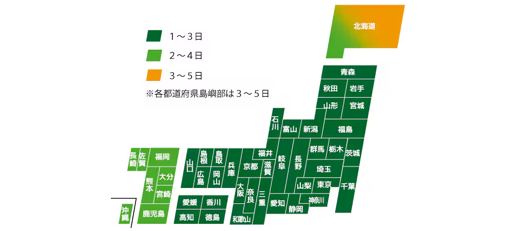 地域によって差はありますが、早い地域なら1〜3日、遠い地域でも3〜5日ほどで届きます