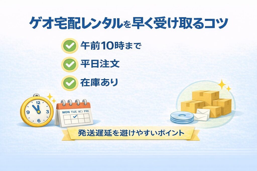 ゲオ宅配レンタルは、注文の仕方やタイミングによって、到着までのスピードが変わることがあります。「少しでも早く届いてほしい」と思いますよね。