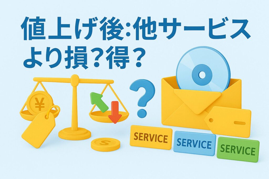 ゲオ宅配レンタルの値上げがあったことで「TSUTAYA DISCASやDMMのほうが安いのかな?」と気になる人は多いですよね。たしかに比較されやすいサービスですが、値上げしたから必ず損というわけではありません。