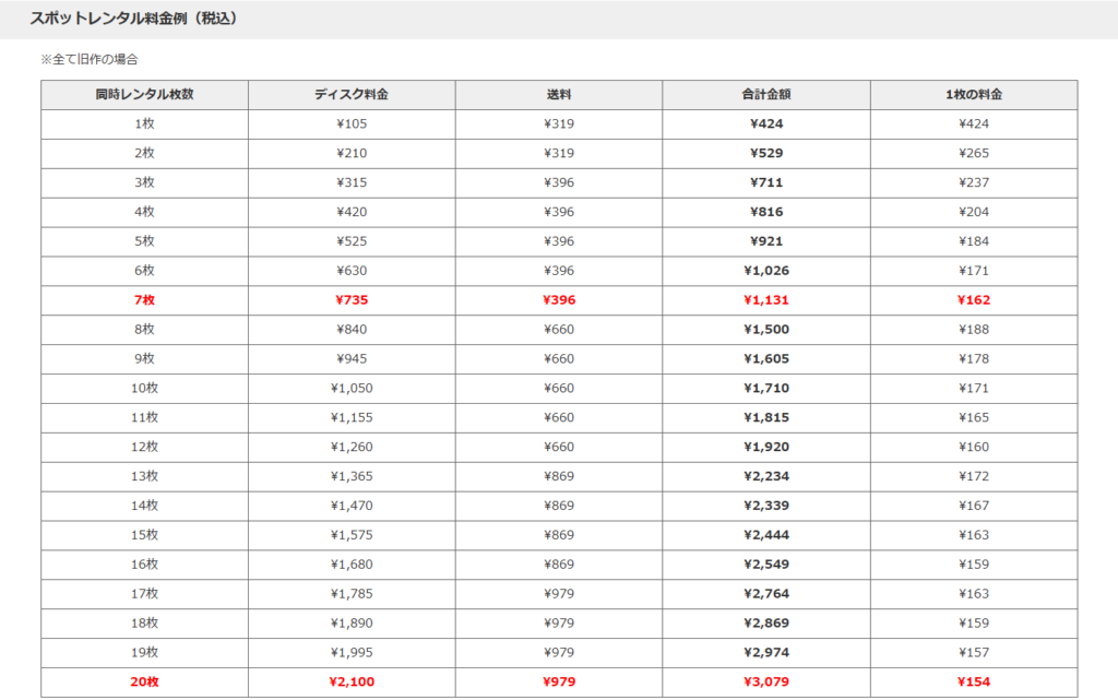 現在は送料の区分が細かくなり、借りる枚数ごとに料金が変わる仕組みになりました
