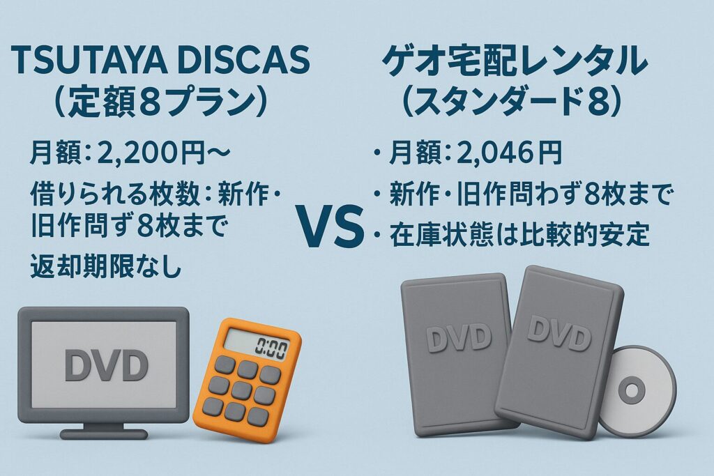 DMMは料金が少し安い一方、在庫や発送の安定性ではゲオ宅配レンタルを選ぶ人が多い印象です