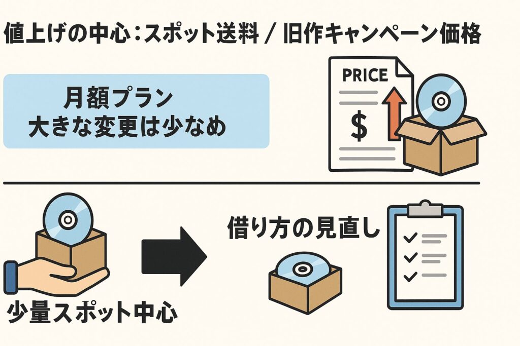 1〜2枚の送料は319円で据え置きですが、3枚目からは送料が上がりますし、旧作の単価も少し上がっています。 そのため、「以前と同じ感覚で数枚借りると、支払いが増えている」ということが起こりやすいのです。